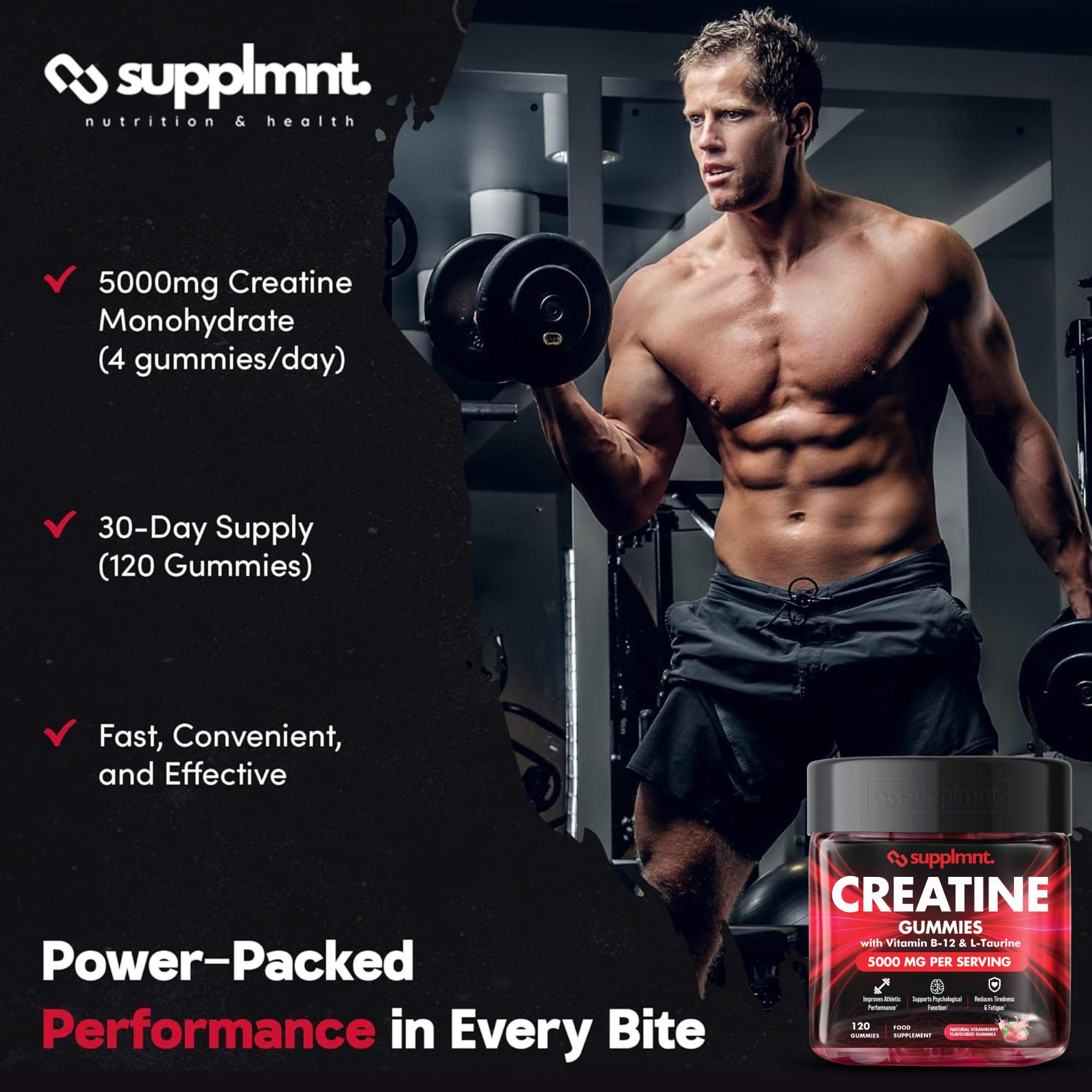 Upgrade your fitness routine with the best Creatine Gummies from Supplmnt. Our Creatine Gummies are delicious, vegan-friendly supplement designed to support muscle growth, strength gains, and athletic performance in and out of the gym.
